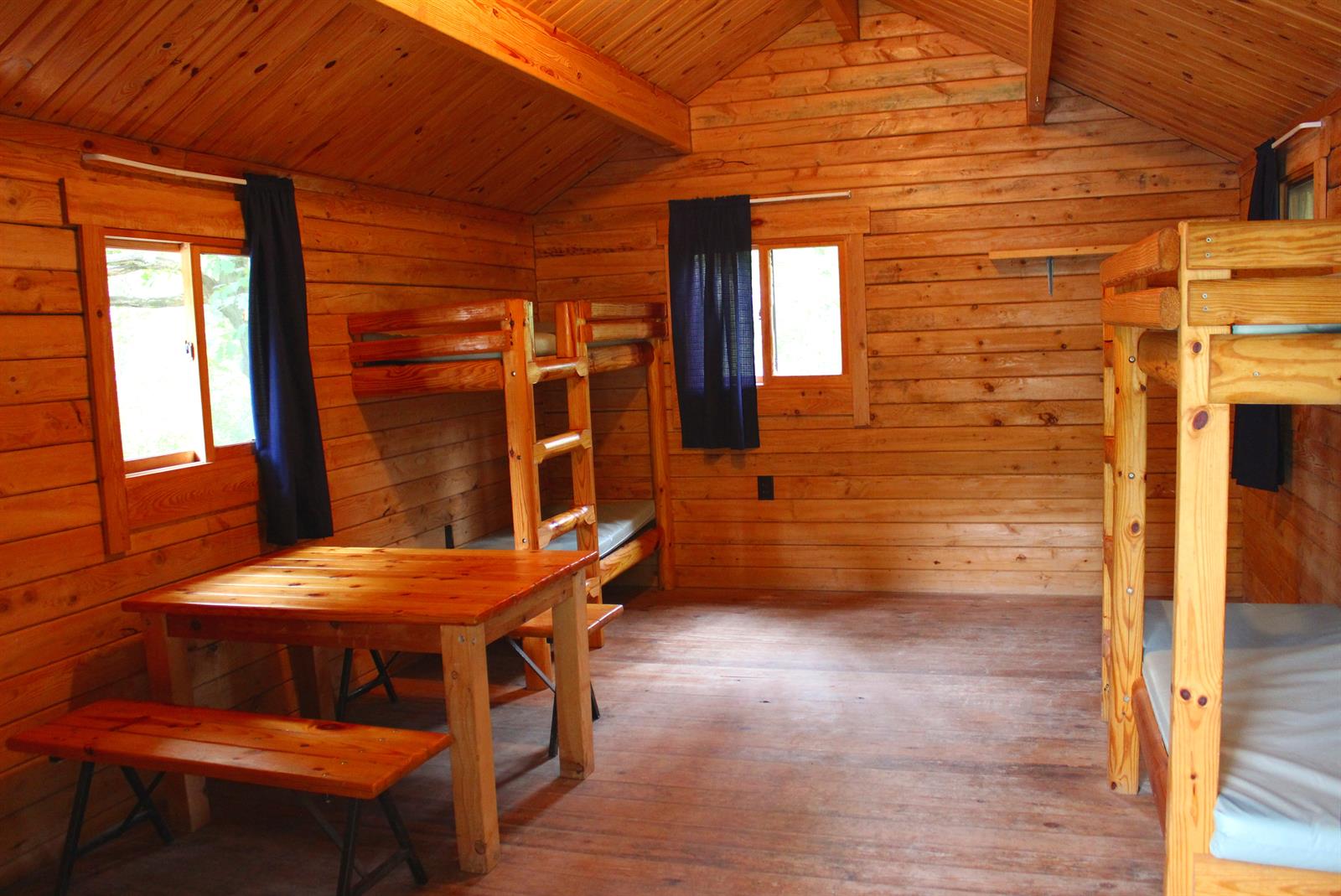 Pinconning Park features six log cabins. These one-room cabins are 13 feet by 19 feet in size. All cabins are equipped with electricity, lighting, two bunk beds (with mattresses), a kitchen table, and two benches. Outside each cabin is a fire ring, BBQ stand, and picnic table. All of the cabins are ADA accessible. The cabins are heated by propane-fueled, forced-air furnaces. Cabin renters are encouraged to bring their own bedding, flashlights, and outdoor cooking supplies. Cabin users may buy firewood and ice from the park. The park office also has flashlights, lanterns, extension cords, propane tanks, and related items for sale.