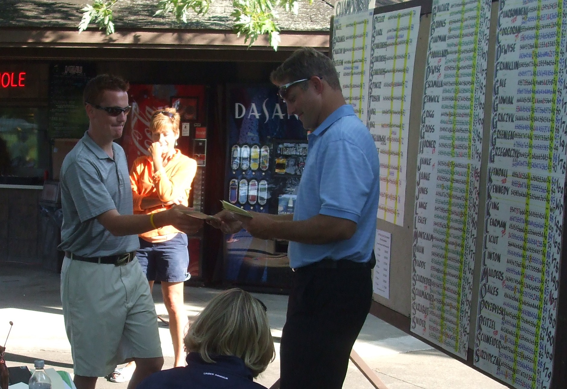 (Right) Cory Snider comes up to receive his second place gift certificate in the First Flight. Cory made it interesting and had a good chance at winning the tournament right down to the end.
