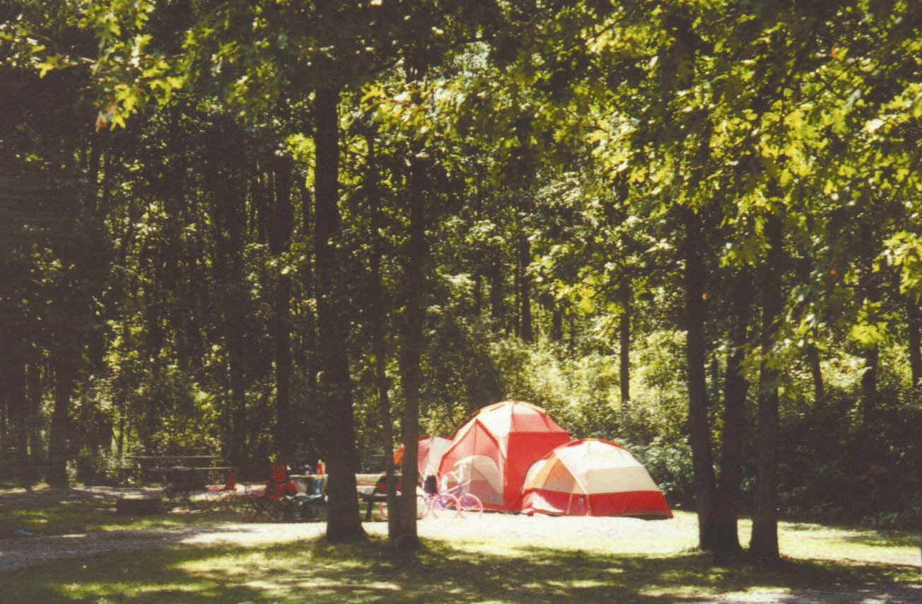 The campground includes 62 modern/semi-modern campsites, with a choice of wooded or sunny lots. Each site includes a picnic table and a fire ring. Twelve sites have concrete camping pads, while the rest have gravel parking pads. The sites are equipped with 20 and 30-amp electrical service, while some have 50-amp service. Sites #1 through #42 have direct water hookups.